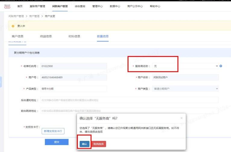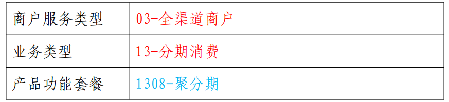 備注: 服務(wù)商名稱填寫“無”。產(chǎn)品類型“信用卡分期”,商戶類型“普通分期商戶”
