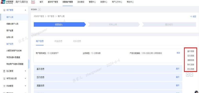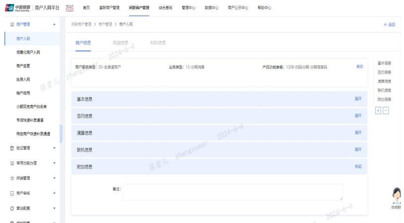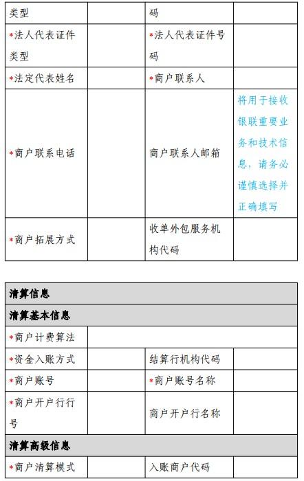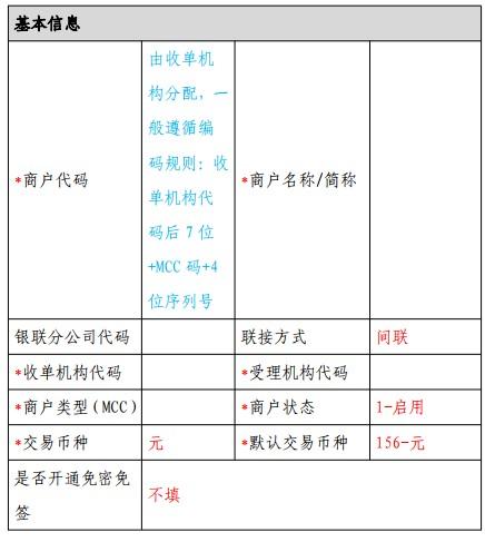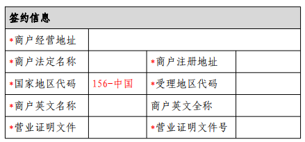 完成商戶服務(wù)類型、業(yè)務(wù)類型、產(chǎn)品功能套餐選擇后,出現(xiàn)“商戶信息”錄入頁面,共涉及基本信息、簽約信息、清算信息、聯(lián)機(jī)信息、附加信息5部分