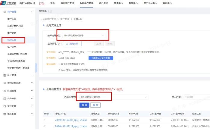 間聯(lián)商戶管理- 批導(dǎo)入網(wǎng) - 選擇批導(dǎo)類型:H4間聯(lián)聚分