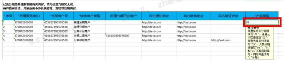 1、請根據(jù)實(shí)際情況填寫外部商戶號(hào)、特殊商戶類型(默認(rèn)填寫普通分期商戶)、后臺(tái)通知地址等信息,產(chǎn)品類型默認(rèn)寫 01。
